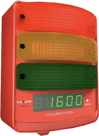 La station d'alarme AS-2 CO2 combine un module d'alarme audio-visuel avec un indicateur d'affichage LED à code couleur et une lecture numérique LCD du niveau de ppm. Elle est conçue pour être montée à l'extérieur de l'espace à surveiller et affichera le niveau de ppm de CO2. L'AS-2 peut être reliée soit aux capteurs de CO2 de bas niveau, soit aux capteurs de haut niveau, ou elle peut être reliée aux deux capteurs pour une redondance complète.