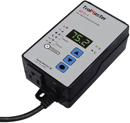 Le BETA-4 est capable de contrôler tout appareil de chauffage ou de refroidissement de 10 ampères ou moins. Il suffit de brancher votre appareil à la prise située en bas du BETA-4. Il utilise 3 boutons, un affichage numérique et offre des réglages de température distincts pour le "jour / nuit" et dispose d'une cellule photoélectrique intégrée.