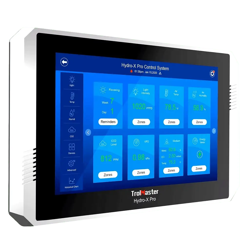 TrolMaster a transformé la technologie des contrôleurs environnementaux avec l'introduction de l'Hydro-X. L'Hydro-X Pro fait avancer cette innovation avec un écran tactile de 10 pouces et un logiciel basé sur le web. L'Hydro-X Pro est entièrement compatible avec tous les modules de contrôle et de périphériques Hydro-X existants. Il offre une flexibilité accrue, permettant aux utilisateurs de personnaliser l'affectation de tout module enfichable. De plus, les utilisateurs peuvent configurer chaque module enfichable avec plusieurs conditions d'activation, offrant des options de contrôle presque illimitées. Conçu pour des applications à pièce unique, l'Hydro-X Pro assure fiabilité et convivialité. Il améliore les capacités de l'Hydro-X original en prenant en charge jusqu'à 50 capteurs et 50 modules de contrôle distincts connectés à un seul Hydro-X Pro. Les utilisateurs peuvent créer plusieurs sous-zones dans un environnement de culture unique en reliant des capteurs spécifiques à des fonctions de contrôle désignées. Le nouveau capteur 4-en-1 dispose d'un écran LCD pour une surveillance pratique sur site. Avec une programmation personnalisable, les utilisateurs bénéficient d'un contrôle étendu, ajustant des variables indépendantes telles que la Température, l'Humidité, le CO2 et la Lumière. Cela permet des réglages flexibles de montée et de descente qui peuvent simuler des environnements extérieurs naturels ou personnaliser entièrement les conditions de culture. Ces ajustements sont représentés visuellement à travers un graphique accessible, offrant aux utilisateurs un contrôle total sur leurs paramètres. Une autre caractéristique notable de l'Hydro-X Pro est son calendrier intégré et ses options prédéfinies que les utilisateurs peuvent utiliser pour définir la "recette" complète d'une culture. Les utilisateurs peuvent définir tous les paramètres, y compris l'Éclairage, la Température, l'Humidité, le CO2 et les Minuteries tout en organisant leurs calendriers de culture multi-semaines. Des rappels automatisés peuvent également être configurés pour aider à s'assurer que les tâches essentielles ne sont pas négligées. L'application TrolMaster facilite les alertes de notification concernant les limites jour/nuit séparées directement à l'utilisateur. Son logiciel basé sur le web offre une fonctionnalité similaire, permettant une gestion transparente du système.