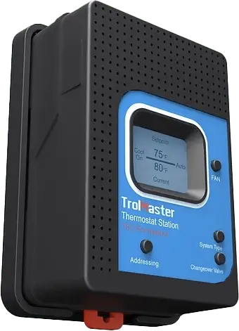 La station de thermostat TS-2 est conçue pour remplacer un thermostat connecté à une unité CVC standard. Le TS-2 peut être utilisé pour contrôler la plupart des systèmes CVC, y compris les pompes à chaleur et les systèmes CVC multi-étages. Le TS-2 est câblé au système CVC en utilisant le même câble de thermostat basse tension, et possède le même code couleur de câblage que la plupart des thermostats. Le Hydro-x permet des réglages distincts pour le jour et la nuit pour chacun des (4) modules TS, de sorte que plusieurs systèmes CVC peuvent être contrôlés par un seul système Hydro-X. Le TS-2 dispose également d'un temps de retard ajustable pour chaque système CVC activé. Cela minimise le courant d'appel élevé et permet de contrôler en toute sécurité jusqu'à 4 systèmes CVC.